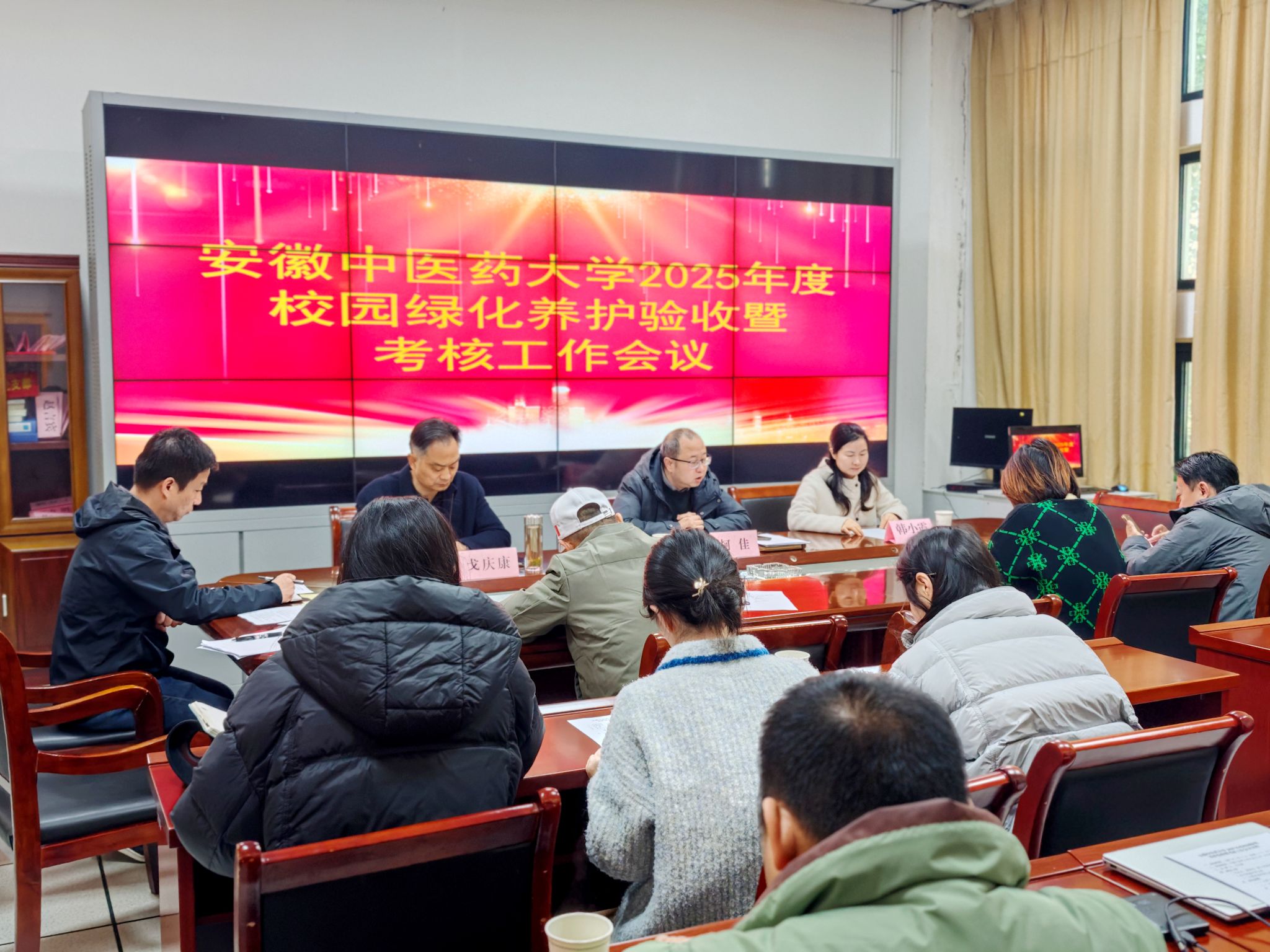 各职能部门代表围绕绿化养护工作依次发言,结合日常监管实际提出针对性意见建议,并依据《校园绿化养护服务2025年度验收评分表》开展考核打分。