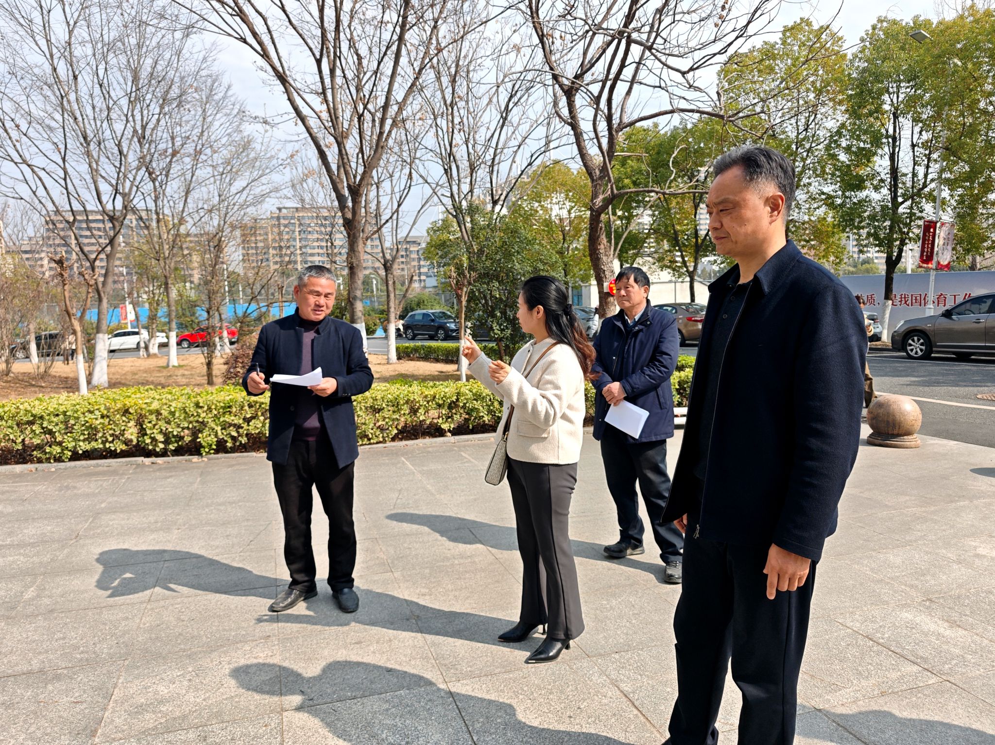 韩小霞副处长深入校园开展实地观察,通过现场巡查的方式对绿化养护效果进行全面评议,从专业角度点评养护工作亮点与不足,并填写专家评分表。